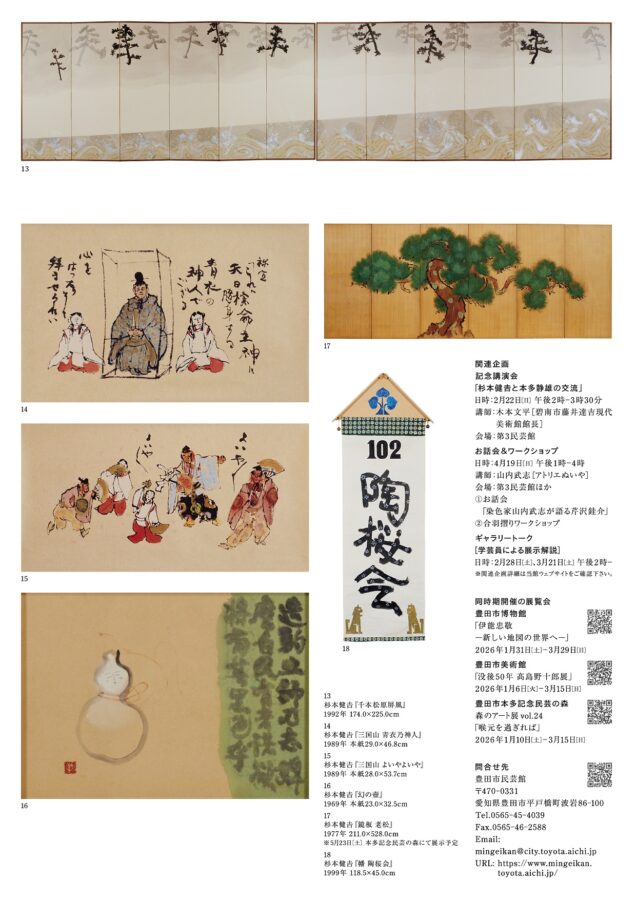 豊田市名誉市民であり、実業家として活躍する一方、日本有数の古陶磁研究家としても知られる本多静雄(1898ー1999)と、名古屋市出身の画家・杉本健𠮷(1905ー2004)。本展では、杉本の絵画作品をはじめ、本多が主催した茶会や創作狂言に関連する作品など、二人の深い交流と文化活動に焦点をあてて紹介します。